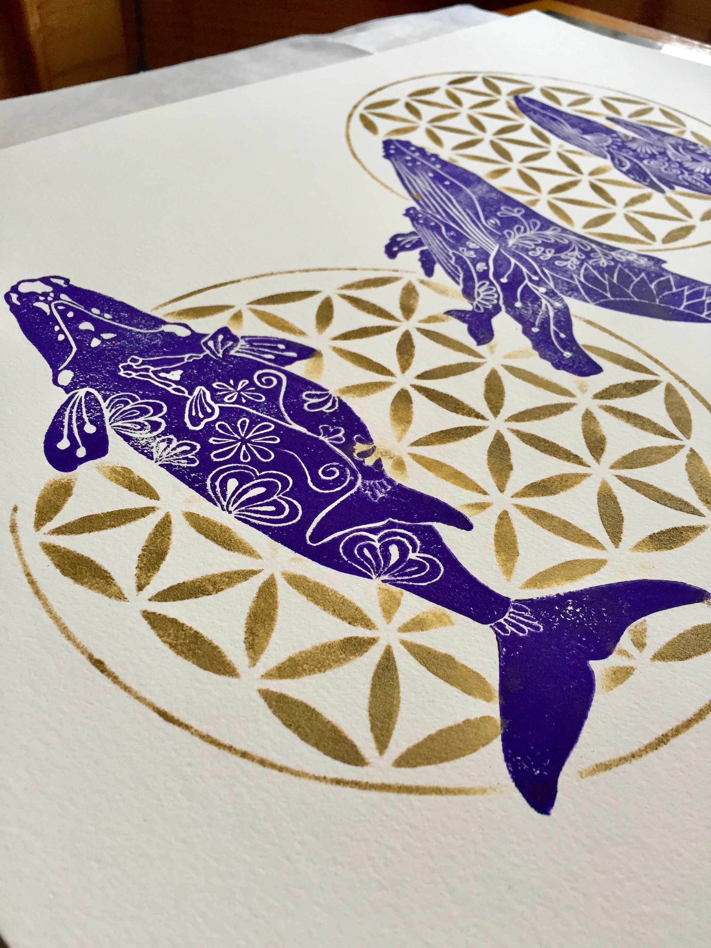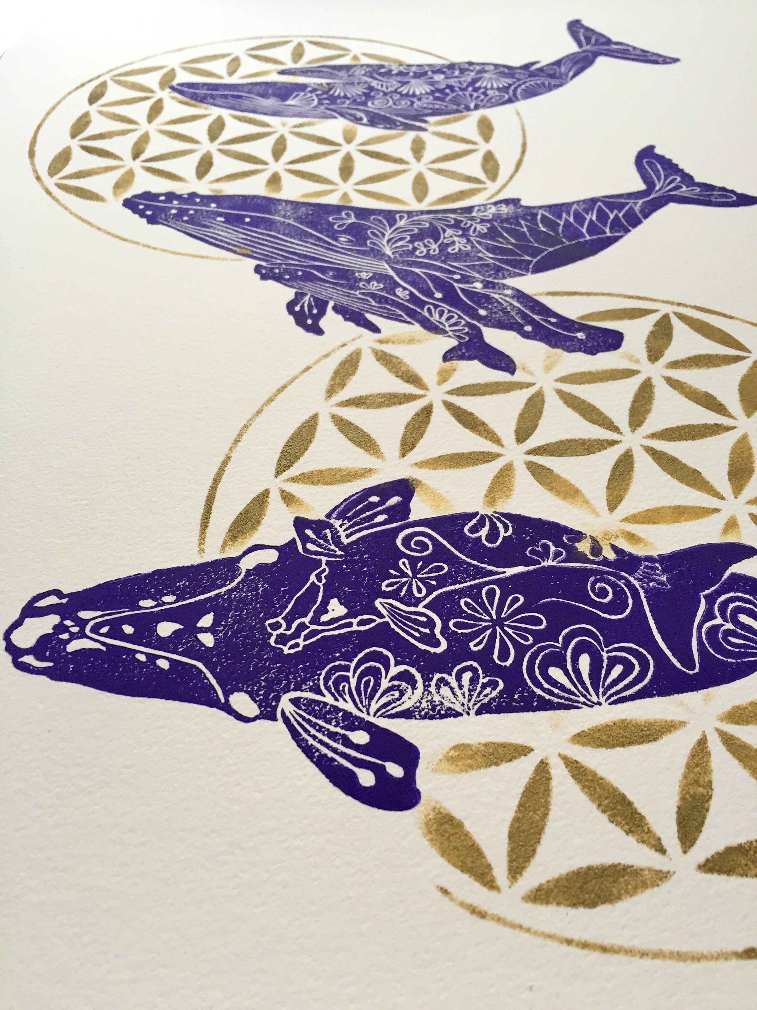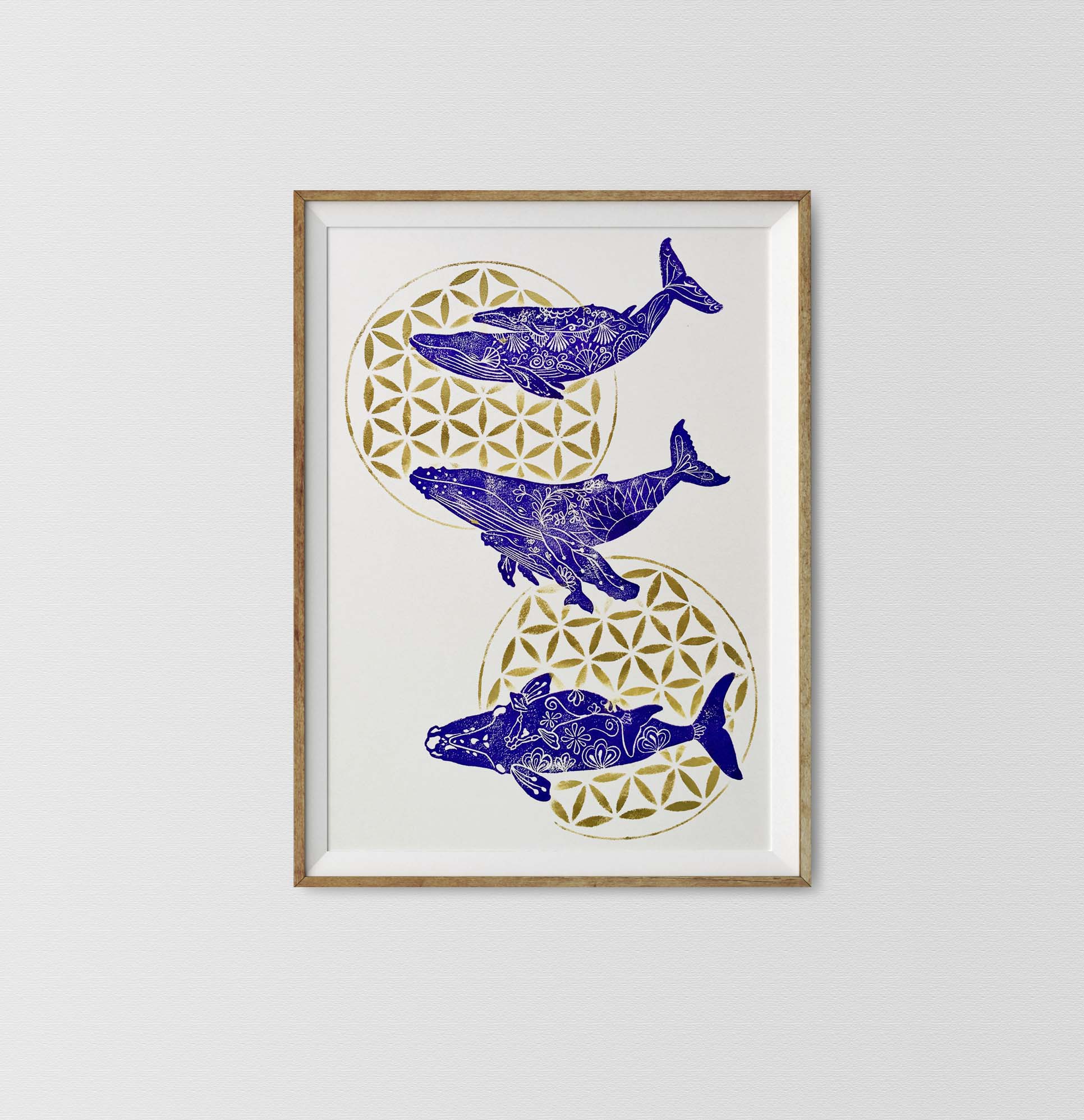 La Ballena Azul, Jorobada y Franca Austral, conectadas con la flor de la vida, patrón usado ancestralmente por muchas culturas. Es la representación visual de la interconexión de la vida, es la matriz de la creación, contiene el origen, la semilla, el huevo y el fruto, que dará origen a todo lo que existe en la naturaleza y el Universo.